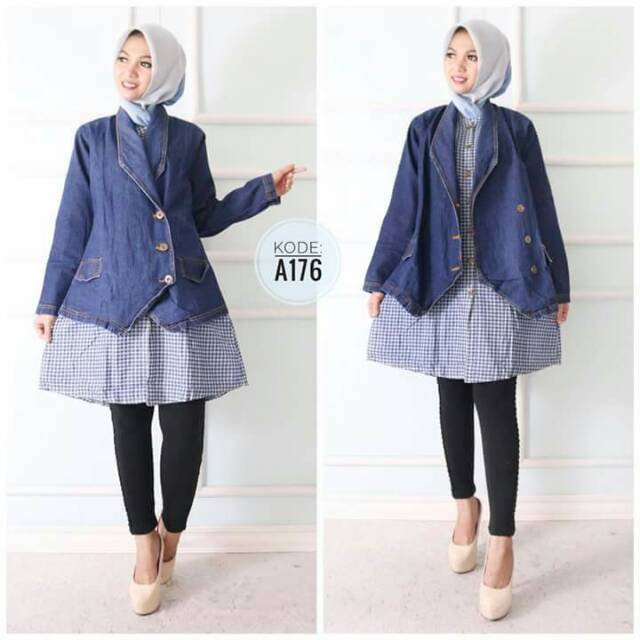 Blazer with inner dari bahan jeans yang tebal, tidak kaku, dan ringan. Model inner bahan jeans lembut motif kotak kecil dipadankan menempel dengan blazer. All size panjang 83cm, lingkar dada 90cm, lingkar bawah baju 120, panjang tangan 52cm. Kancing bukaan depan. Tersedia warna biru tua (on model) dan biru muda.