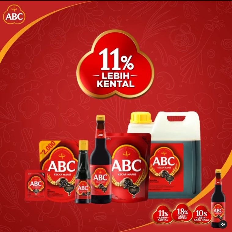 Kecap manis ABC dibuat dengan kedelai, gandum dan gula merah pilihan sehingga menghasilkan kecap manis dengan citarasa mantap, hitam dan kental. KOMPOSISI : Gula, air, garam, kedelai, biji gandum, pengawet natrium benzoat