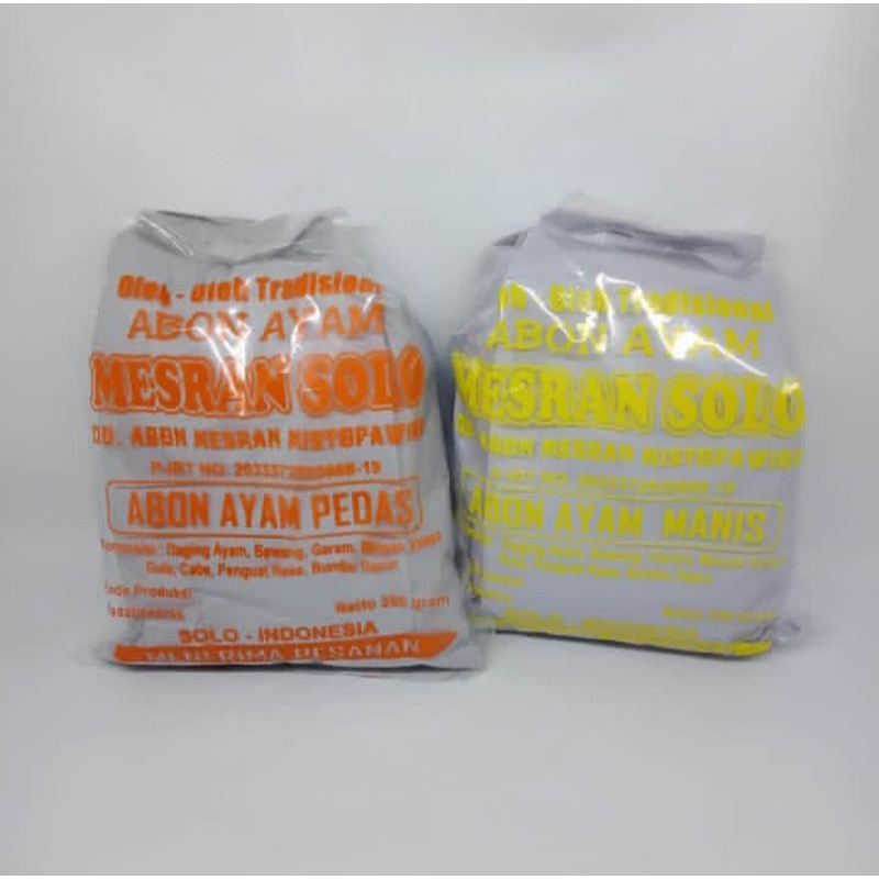 Abon Ayam Mesran Solo Oleh-oleh tradisional dari kota Solo “Abon Sapi Mesran Solo”. sangat cocok untuk dijadikan lauk ataupun penambah lauk pauk anda komposisi: daging sapi, bawang, garam, minyak kelapa, gula, penguat rasa, dan beberapa bumbu dapur.