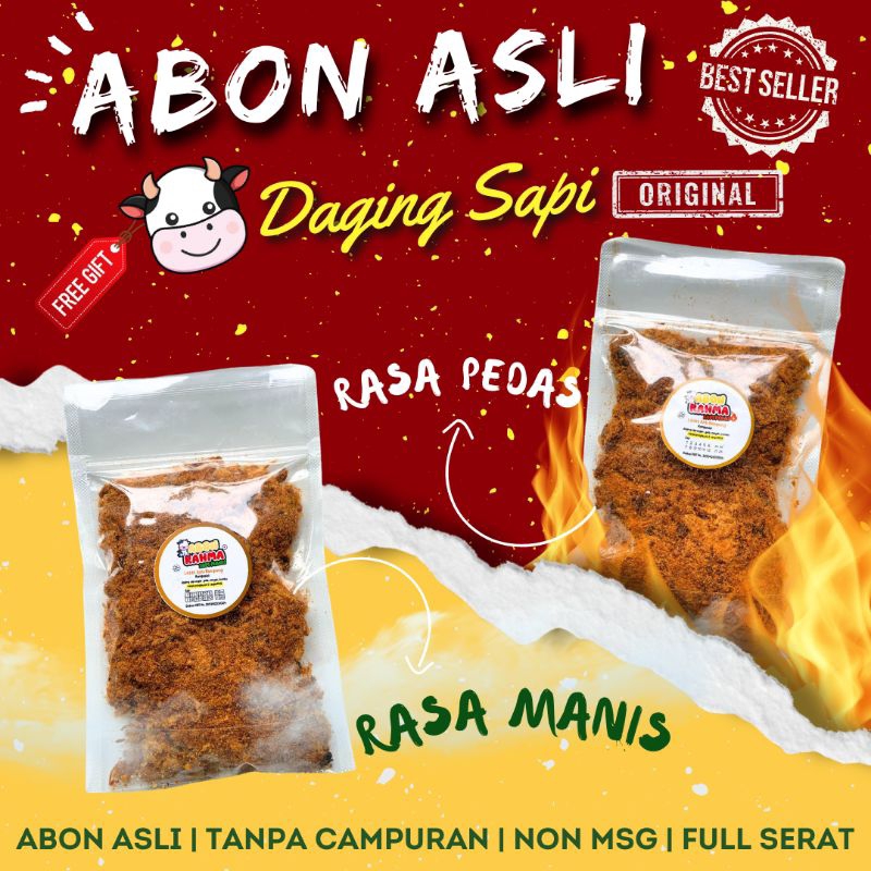 Abon asli daging sapi, terbuat dari 100% abon asli, full serat, tekstur yang lembut sehingga cocok untuk bayi mpasi. rasa lezat, enak no rempong.