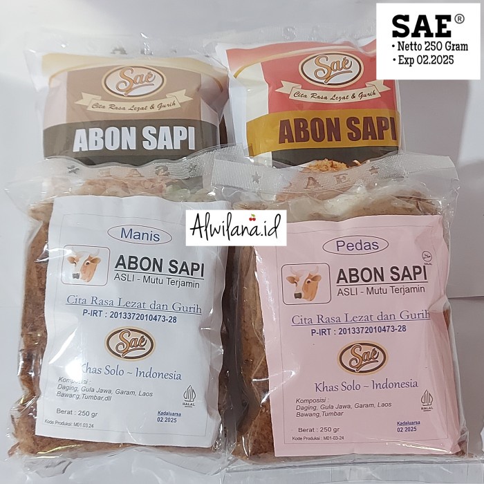 ABON SAPI SAE ORIGINAL DIJAMIN 100 % SAE DIJAMIN 100 % HALAL NETTO 250 GRAM TERDAPAT PRES LOGO SAE KOMPOSISI : DAGING, GULA JAWA, GARAM, LAOS, BAWANG, TUMBAR P-IRT No.2013372020444-20 KHAS SOLO~INDONESIA BARANG SELALU READY DAN BARU BARANG YANG DIKIRIM SESUAI GAMBAR DAN DESKRIPSI TERDAPAT EXP DIKEMASAN