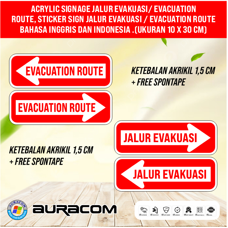 ACRYLIC STICKER SIGN JALUR EVAKUASI/ EVACUATION ROUTE, BAHASA INGGRIS DAN INDONESIA .(E28)