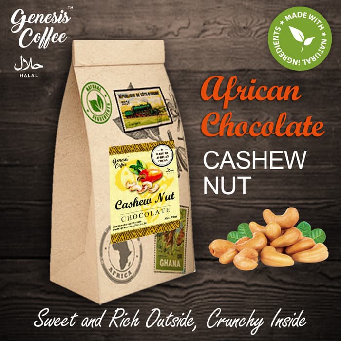 Nikmati kerenyahan kacang cashew alami dibalur coklat dari Afrika.