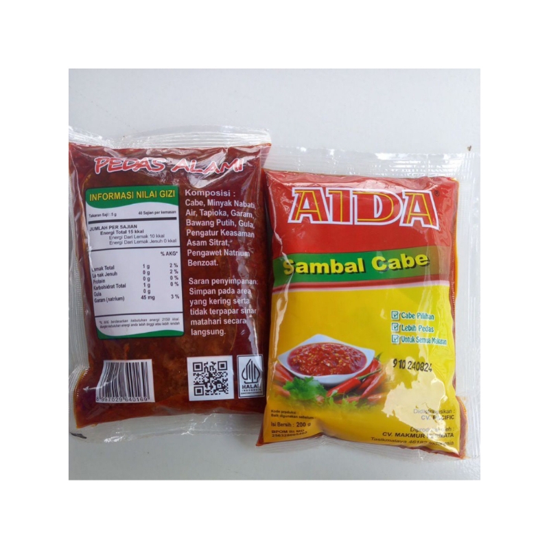 Aida chili oil, sambel cabe, sambal cabe asli terbuat dari cabe pilihan, garam, gula, bawang putih, penyedap rasa. Kemasan 200 gram.