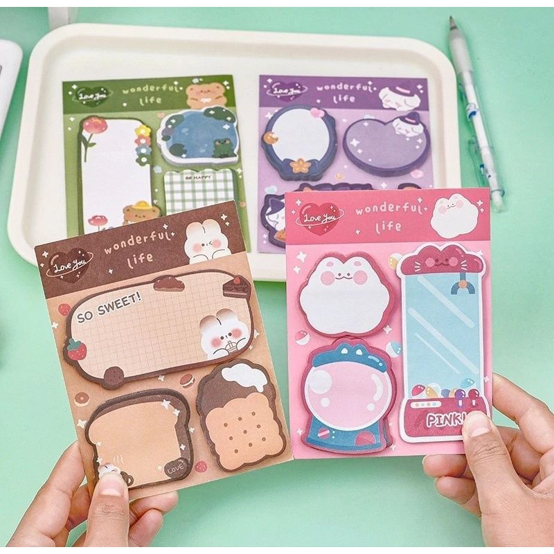 sticky notes lucu dan imut yang sudah dilengkapi lem di belakangnya sehingga bisa langsung ditempelkan, berisi 20 lembar (total satu set 60 lembar). tersedia beberapa varian warna.