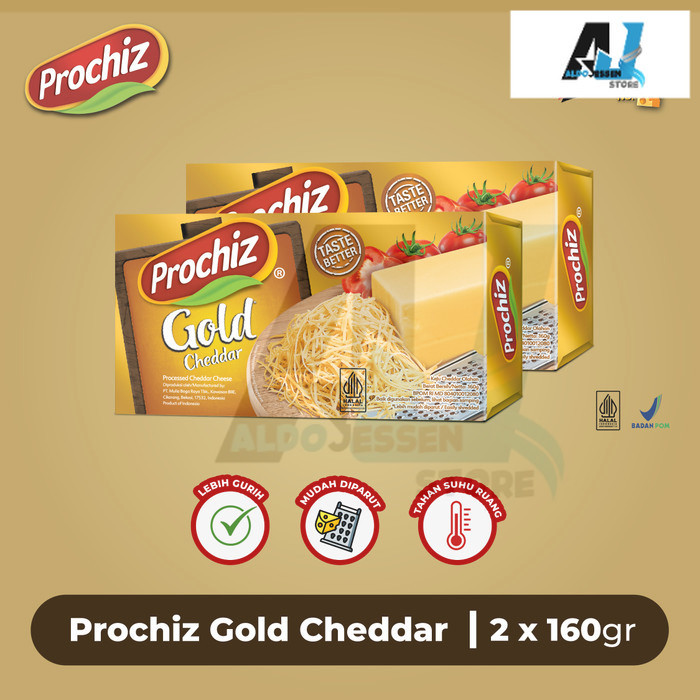 PROCHIZ Gold merupakan keju cheddar olahan dengan menggunakan bahan baku berkualitas dan mengandung susu memiliki rasa gurih, asin, dan enak. Tersedia dalam 2 ukuran, 160 gr dan 2 kg.