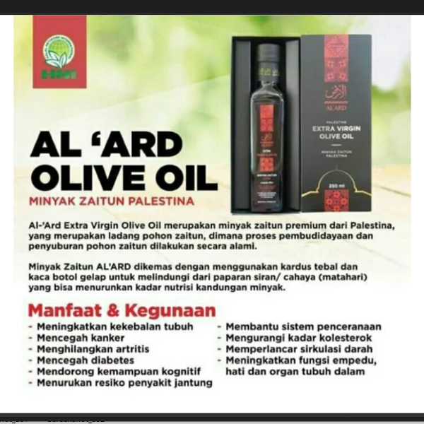 Al-'Ard Extra Virgin Olive Oil merupakan minyak zaitun premium dari Palestina, yang merupakan ladang pohon zaitun, dimana proses pembudidayaan dan penyuburan pohon zaitun dilakukan secara alami.