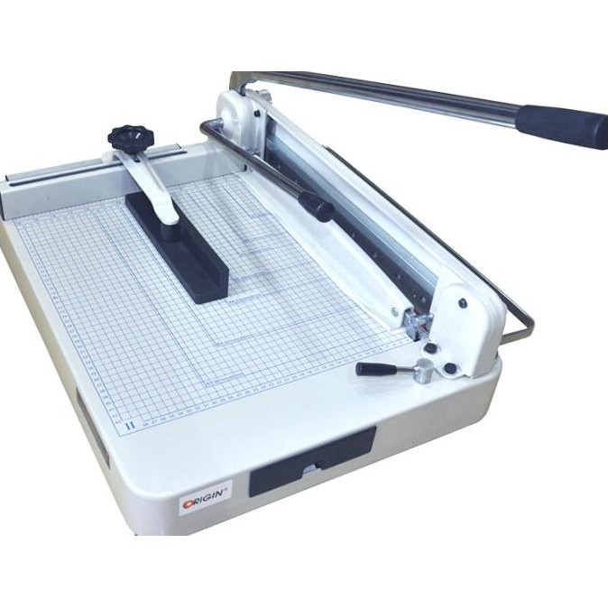 Alat pemotong kertas ini bisa memotong kertas hingga ketebalan 400 lembar dengan tenaga kecil. Disertai penahan kertas dengan system press yang lebih gampang dipake dan cepat dalam pemotongan kertas. Pisau terbuat dari bahan baja yang sangat tajam dan kuat buat pemakian rutin. Tersedia kaki besi untuk menaruh pemotong kertas ini.
