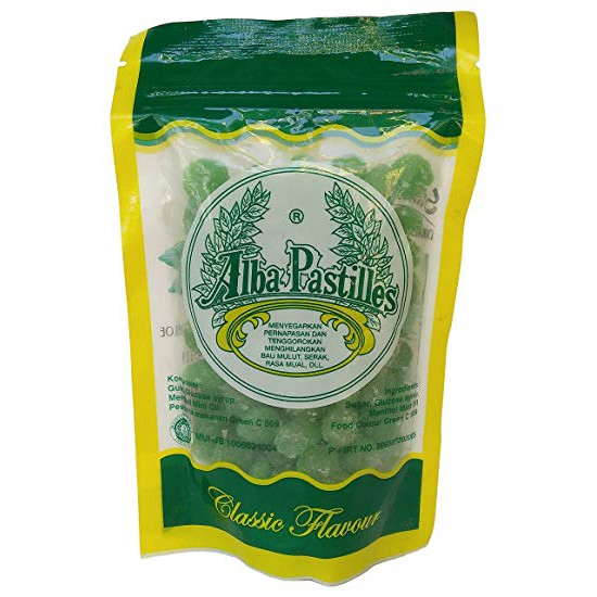 Permen mint menthol Alba Pastilles asli CRTD - P.K.G. Gelora Soekaboemi. Penyegar pernafasan dan tenggorokan, menghilangkan bau mulut, serak dan rasa mual.