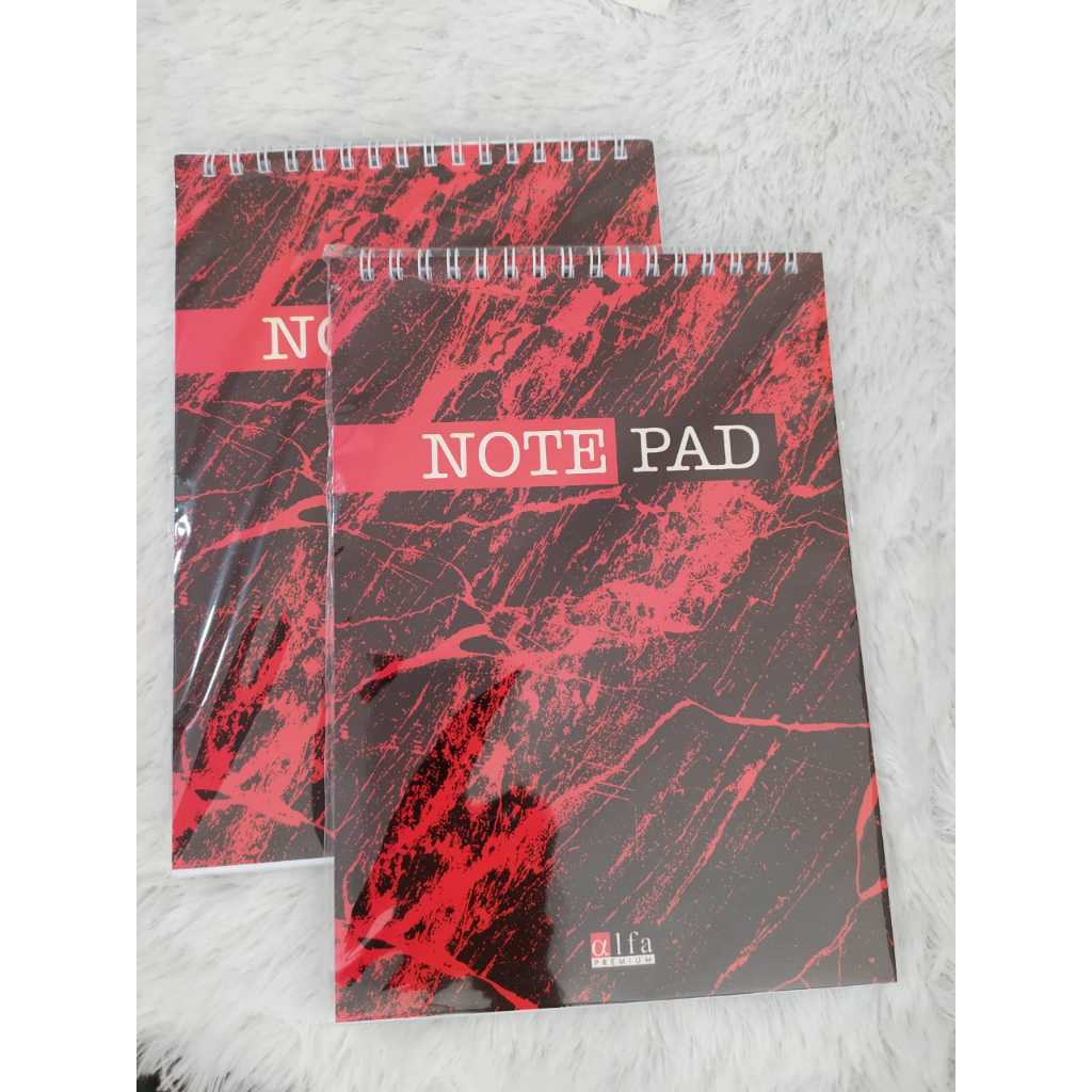 Tersedia Note Pad Spiral A5 Marmer Alfa. Ini adalah produk dengan ukuran A5, spiral, dan tersedia dalam tiga warna cover (Merah, Biru, dan Hijau).