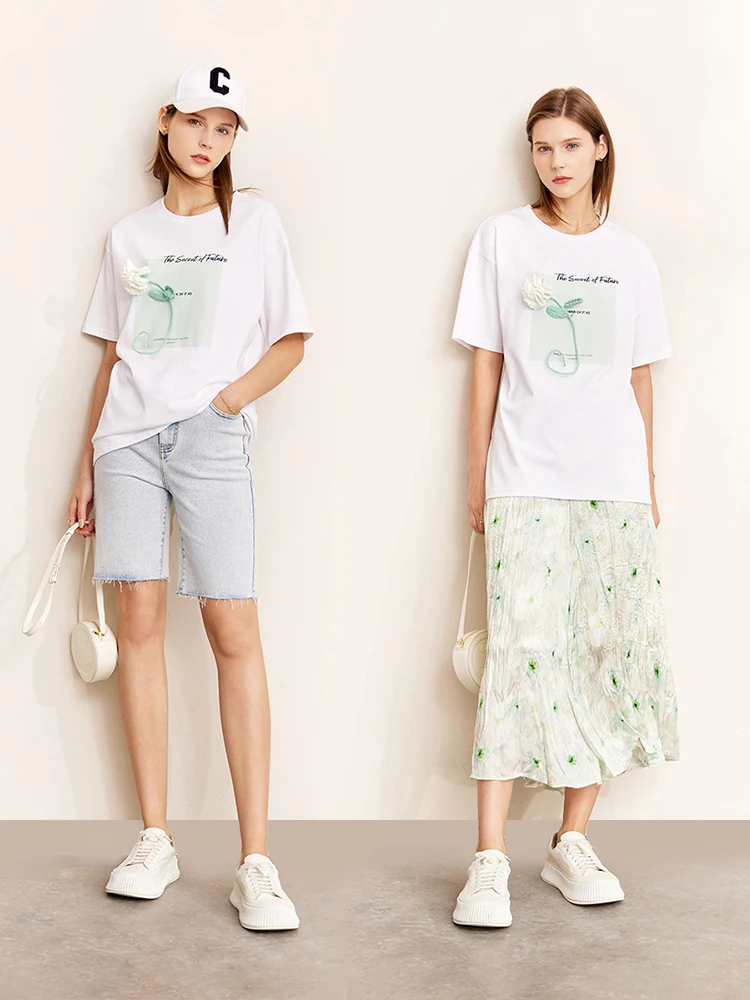 AMII минималистская модель 2023 Φ для женщин с трехмерным принтом и коротким рукавом Новая нишевая свободная одежда с круглым вырезом 12290017