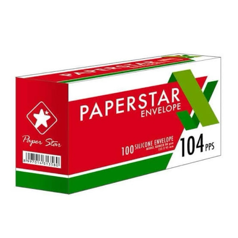 Amplop 104 Paper Star Dengan Silicone Seal Paper Bahan Baku HVS Tebal 80 Gsm Ukuran : 152 mm x 95 mm Isi / dus : 100 Pcs