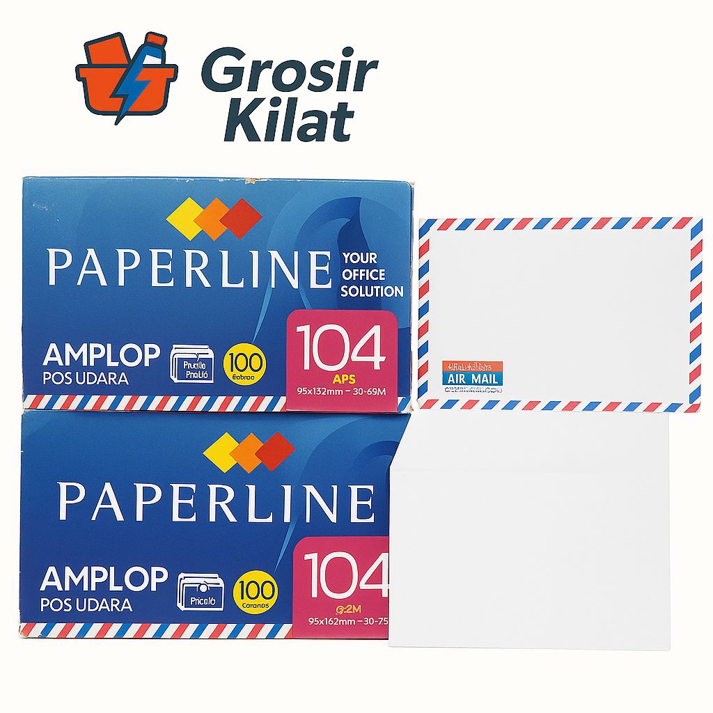 Produk amplop merek Paperline tipe 104 APS ukuran 95 x 152 mm, dengan ketebalan 80 GSM. Kotak berwarna biru ini berisi 100 lembar amplop pos udara (Air Mail) dengan sistem Peel & Seal yang praktis untuk penggunaan sehari-hari