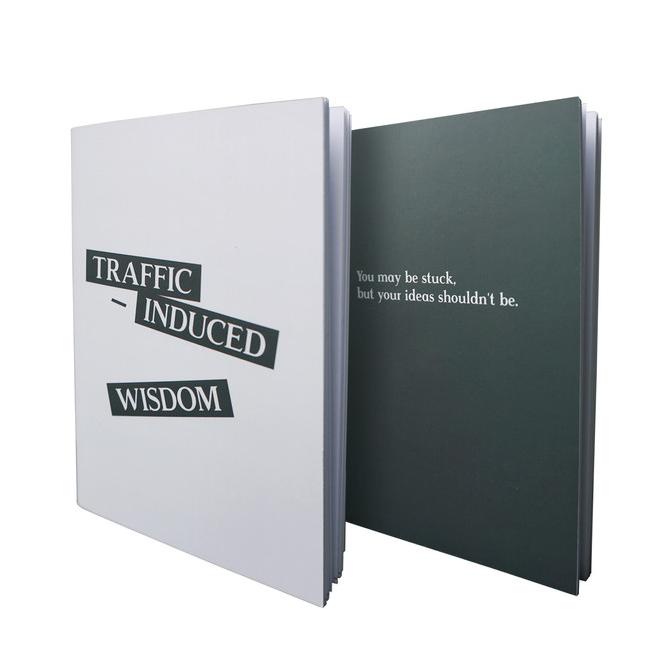 Text: Off White side - 'Traffic Induced - Wisdom' , Dark Green side - 'You may be stuck, but your ideas shouldn't be.'