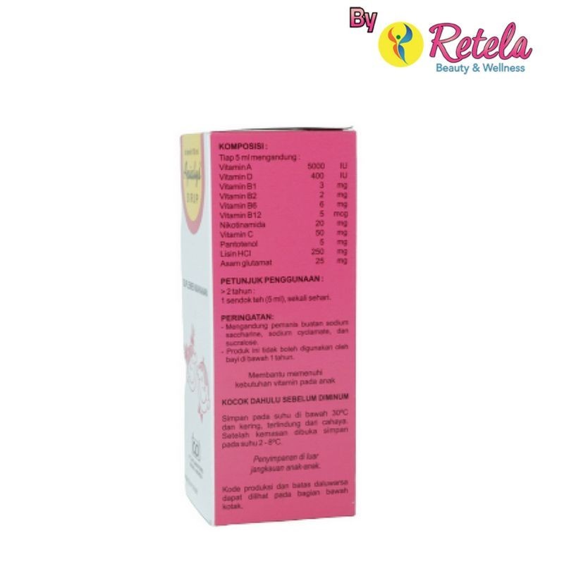 Tiap 5 ml mengandung : Vitamin A 5000 IU, Vitamin B1 3 mg, Vitamin B2 2 mg, Vitamin B6 6 mg, Vitamin B12 5 mcg, Vitamin C 50 mg, Vitamin D 400 IU, Nicotinamide 20 mg, Lysine HCl 250 mg, Pantothenol 5 mg, Asam glutamat 25 mg.