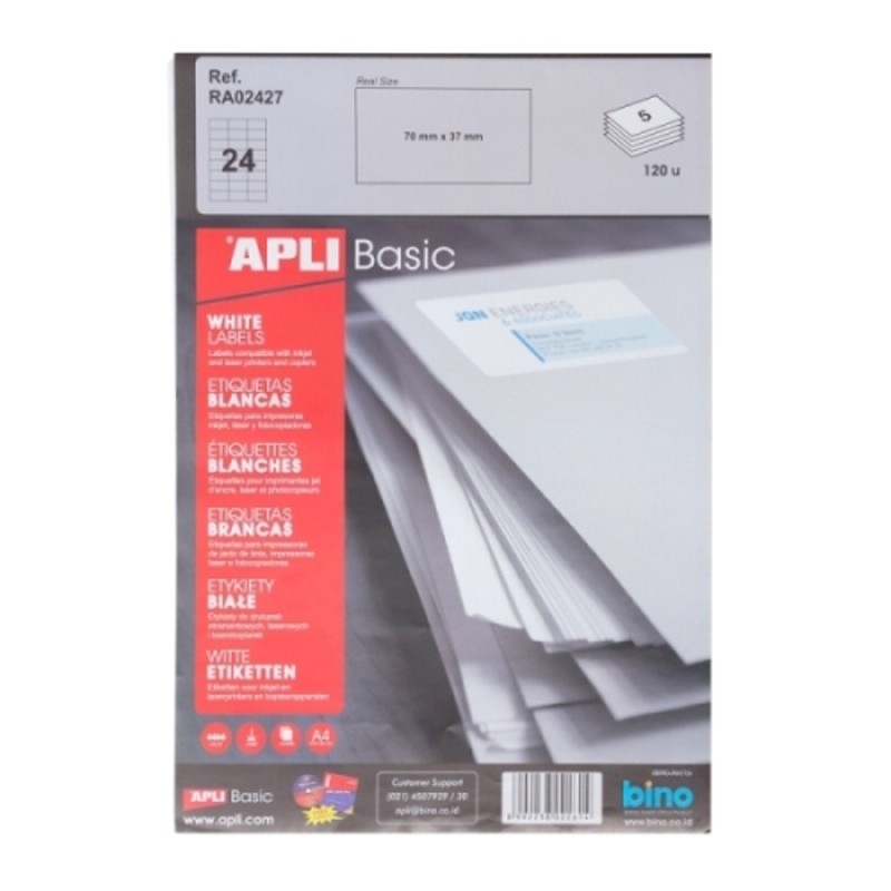 APLI Computer Label merupakan solusi untuk masalah anda dalam pencetakan label. Mencetak alamat pelanggan dari data yang sudah ada, mencetak simbol maupun logo perusahaan, teks dan gambar, bahkan barcode sesuka anda. Dapat digunakan di semua printer inkjet, laser bahkan mesin fotokopi. Untuk kenyamanan pemakai, kami menyediakan software khusus yaitu APLI Soft Pro, yang dapat mencetak semua ukuran dan jenis label APLI, dengan cepat dan mudah di dalam pengoperasiannya, dan dengan hasil cetak yang tepat. Template label APLI sudah tersedia secara standar di software Microsoft Office. Tipe RA02427 dalam kemasan Blister 1 pack berisi 5 lembar, dalam 1 lembar berisi 24 buah sticker berukuran70 X 37 mm dengan model square corner (sudut tajam di setiap ujungnya). total sticker dalam 1 pack = 120 buah sticker.