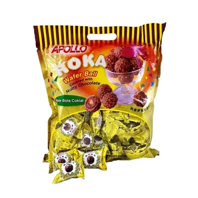 Apollo Roka Wafer Bola Coklat. Berbentuk bola dengan coklat wafer yang renyah dan enak. Camilan kesenangan anak-anak.