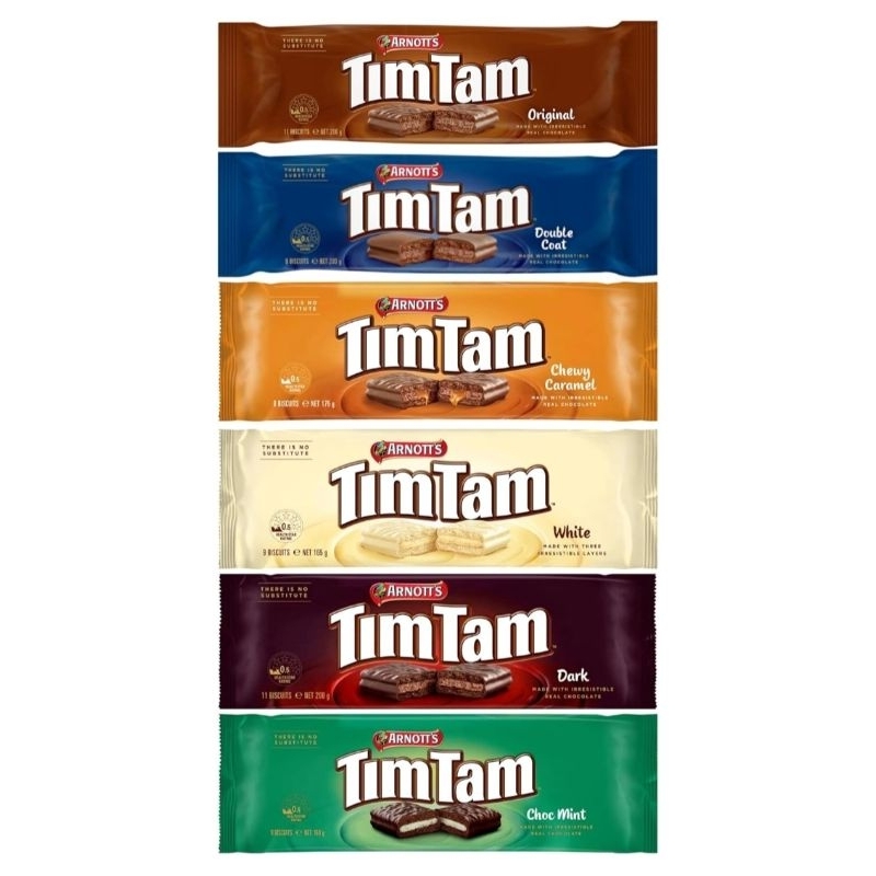 Rasa Tim Tam, termasuk rasa original, double coat, chewy caramel, classic dark, deluxe dark chocolate mint, Murray River salted caramel, white, salted caramel brownies, dan decadent triple chocolate.