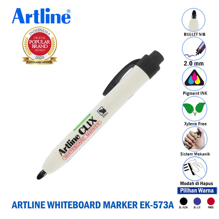 Artline Whiteboard Marker CLIX (Bullet) 2.0mm EK-573A adalah spidol whiteboard marker dengan model cetek atau dengan tombol sebagai penutup dibagian atas seperti ballpoint. Dengan tinta non permanent (dapat dihapus) dan clip penjepit saku dibagian casing menjadikan spidol papan tulis ini sangat cocok digunakan untuk mobile dan dapat digantungkan pada kantung