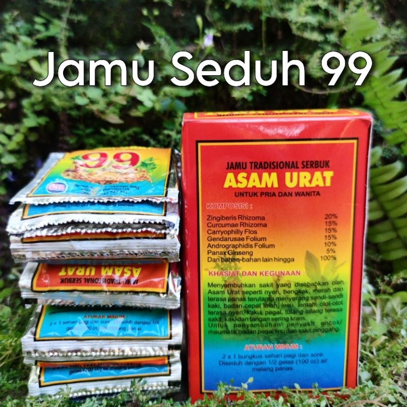 Terbuat dari ramuan warisan leluhur, jamu seduh Asam Urat 99 terbukti sangat baik dalam mengatasi asam urat, rematik, flu tulang, kesemutan, nyeri pinggang, pegal linu, sampai gejala stroke.