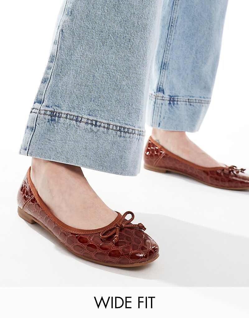ASOS DESIGN Wide Fit – Lullaby – Светло-коричневые балетки на плоской подошве под крокодила с бантом, широкий крой
