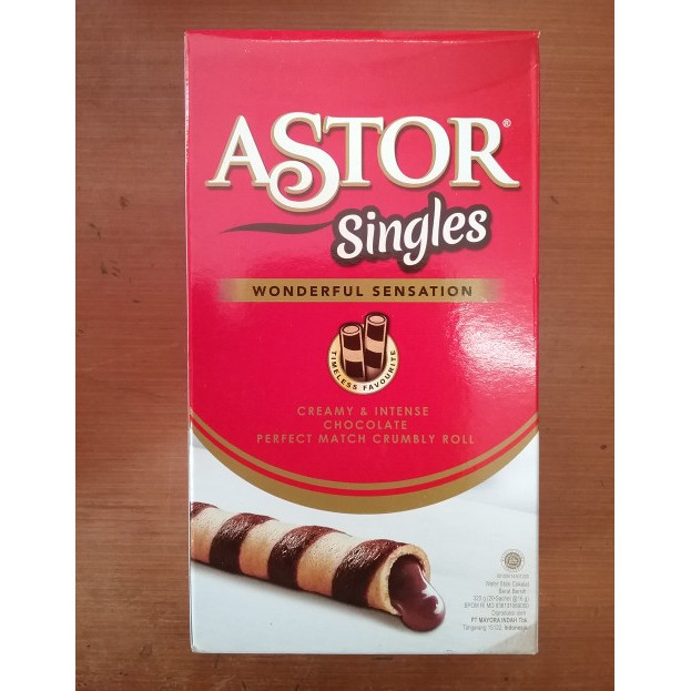 Astor Singles merupakan varian baru dari Astor yang hadir dengan kemasan satuan. Astor Singles merupakan paduan sempurna antara wafer renyah dan isi cokelat yang tebal & banyak.