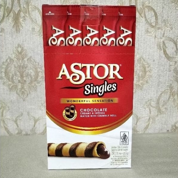 Wafer stik berbentuk roll dengan isian coklat lezat di tengahnya.