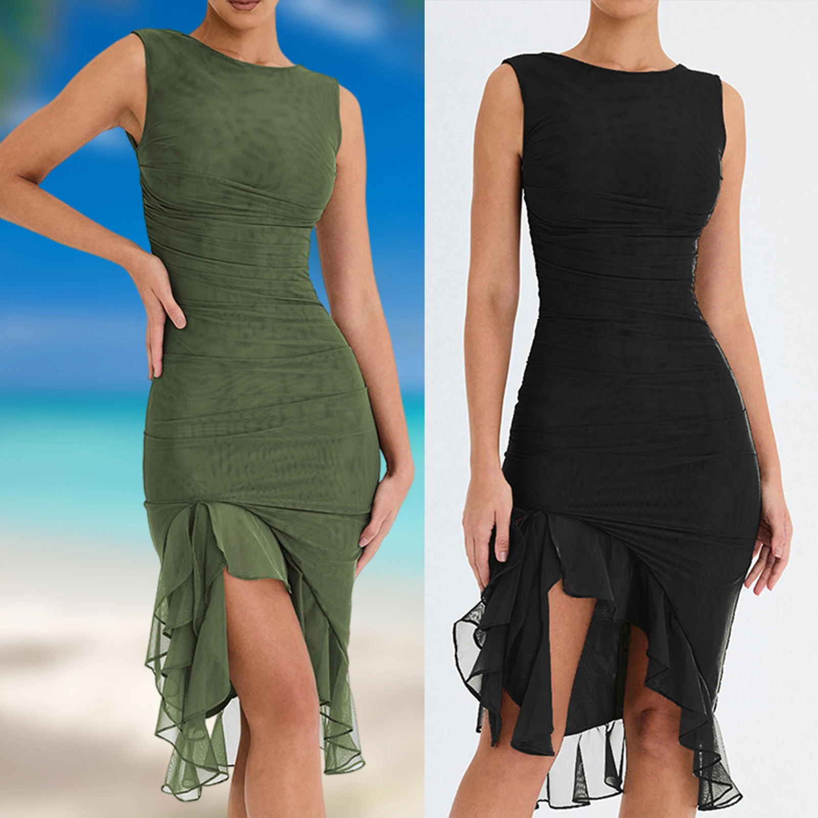 Women Sexy Long Dresses Round Neck Sleeveless High Split Dresses Slim Fit Ruffled Hem Fashion Backless Party Dresses