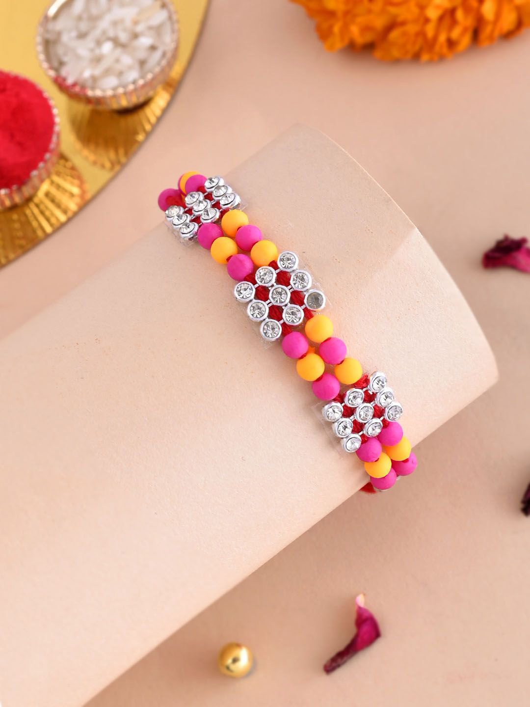 Pink, yellow and white stones studded and beaded thread rakhi, has tie-ups closureComes with roli chawal & greeting card