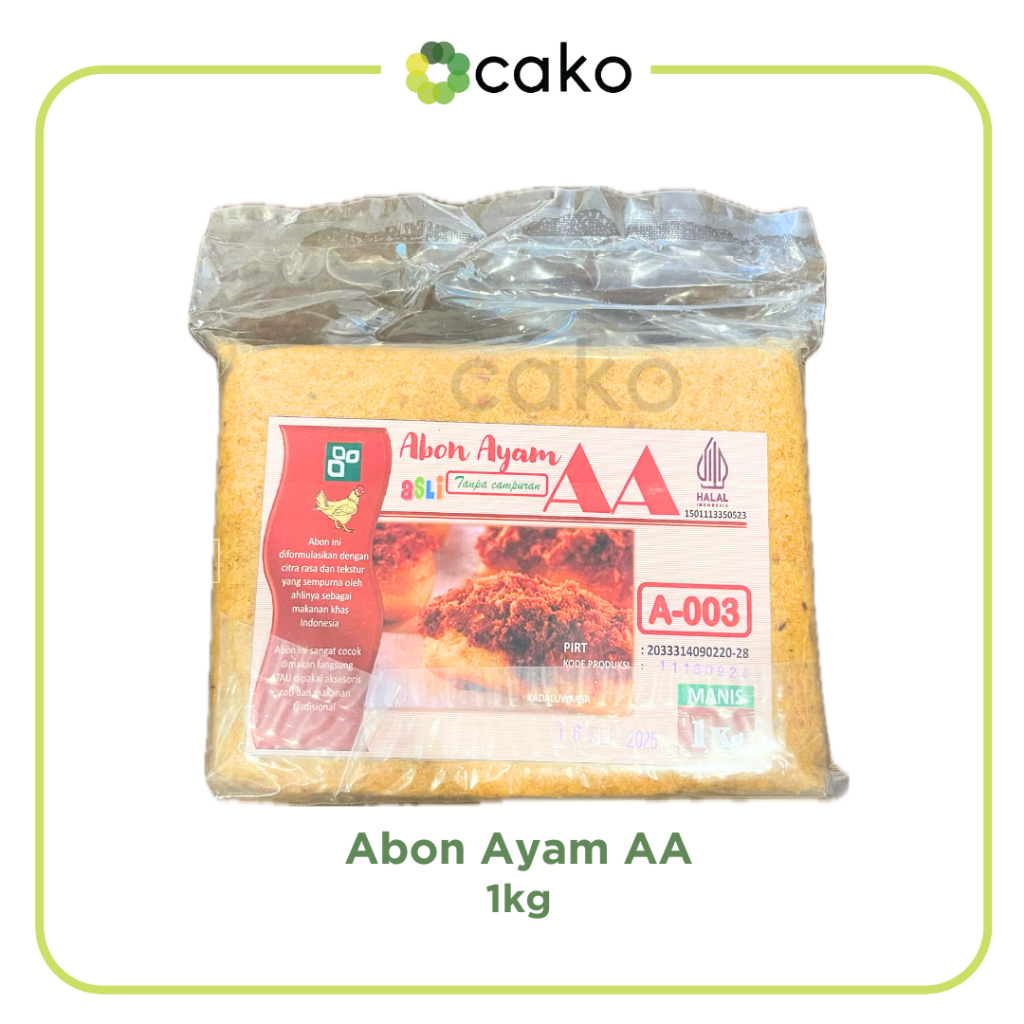 Abon Ayam Manis AA 1kg, AA Abon ayam manis terbuat dari daging ayam premium yang diolah dengan bumbu-bumbu tradisional sehingga membuat rasa abon ini menjadi tidak terlupakan. Sangat cocok dimakan langsung atau sebagai tambahan di roti dan makanan tradisional.