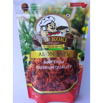 Abon Sapi Cap Koki terbuat dari 100% daging sapi segar pilihan yang diolah secara khusus dengan bumbu rempah khas sehingga menjadikan Abon Sapi Cap Koki memiliki kerenyahan serta kualitas rasa yang sangat lezat dan berbeda dengan abon sapi yang lain. Dikemas dalam standing pouch aluminium foil plus zipper menjadikan abon sapi Cap Koki bisa bertahan lama.