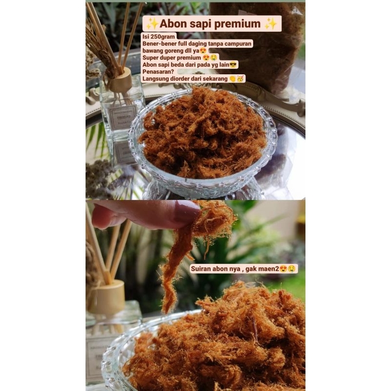 Abon Sapi Asli merupakan abon yang terbuat dari bahan daging sapi pilihan dan rempah-rempah tradisional Ttanpa pengawet dan tanpa pewarna diolah secara higienis sehingga menghasilkan rasa yang gurih, nikmat dan lezat. Sangat cocok untuk dijadikan lauk pauk sehari-hari.