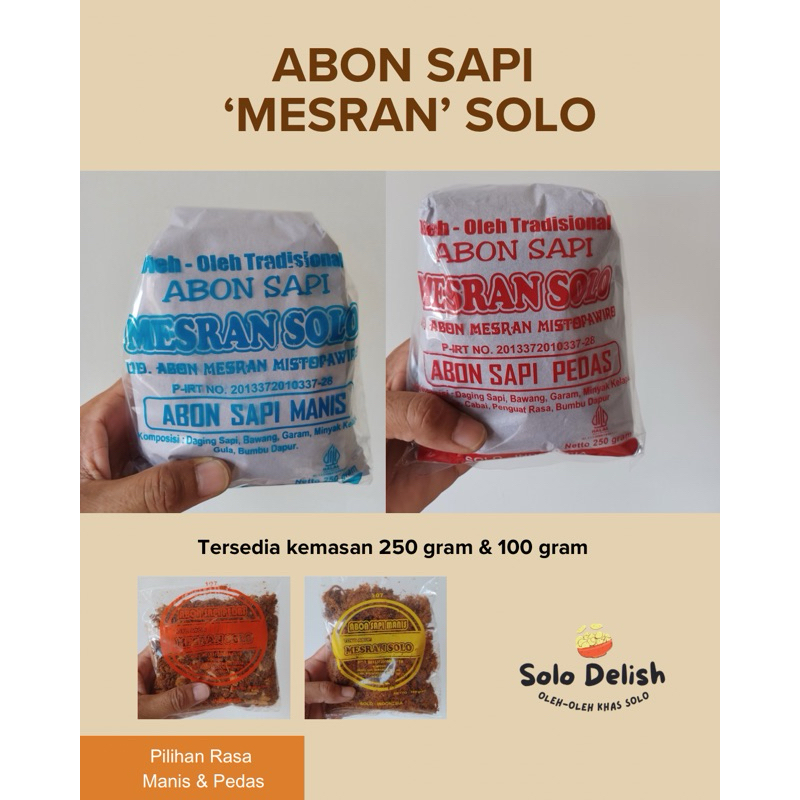 Abon sapi Mesran Solo, pedas/manis, 100 gr - 250 gr. Abon legendaris dari Kota Solo dengan cita rasa gurih, manis/pedas dan renyah. Terbuat dari daging sapi yang diolah dengan bumbu tradisional khas Solo.