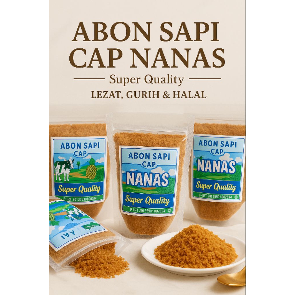 Nikmati cita rasa autentik Indonesia dengan Abon Sapi Cap NANAS, abon sapi pilihan dengan tekstur lembut, rasa gurih-manis seimbang, dan aroma yang menggugah selera. Dibuat dari daging sapi berkualitas tinggi, tanpa pengawet, dan diolah secara higienis.