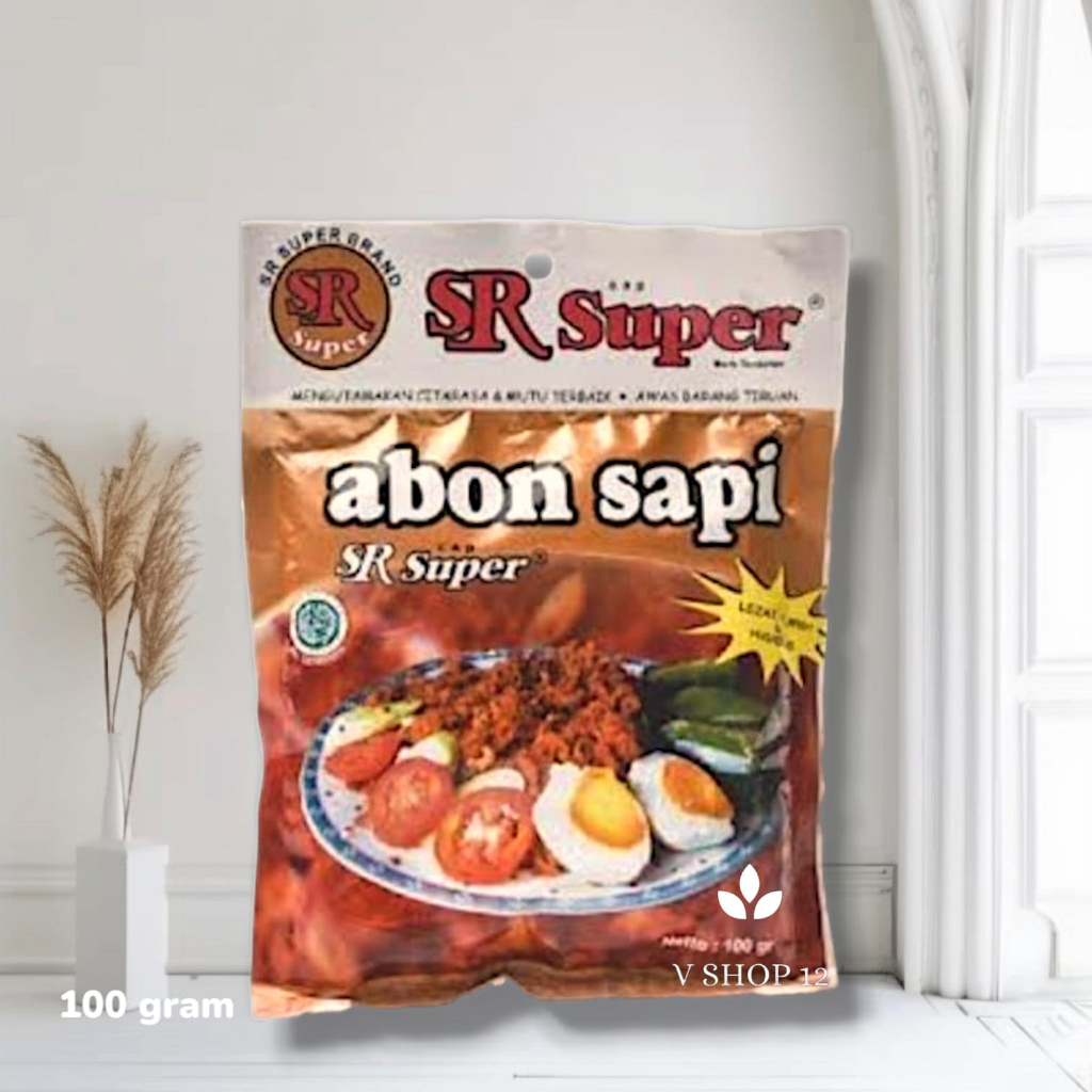 Abon daging sapi SR Super terbuat dari daging sapi pilihan dan bumbu bumbu berkualitas baik.
