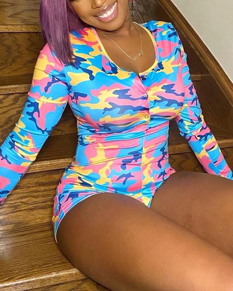 Abstract Print Button Design Long Sleeve Romper, Multicolor