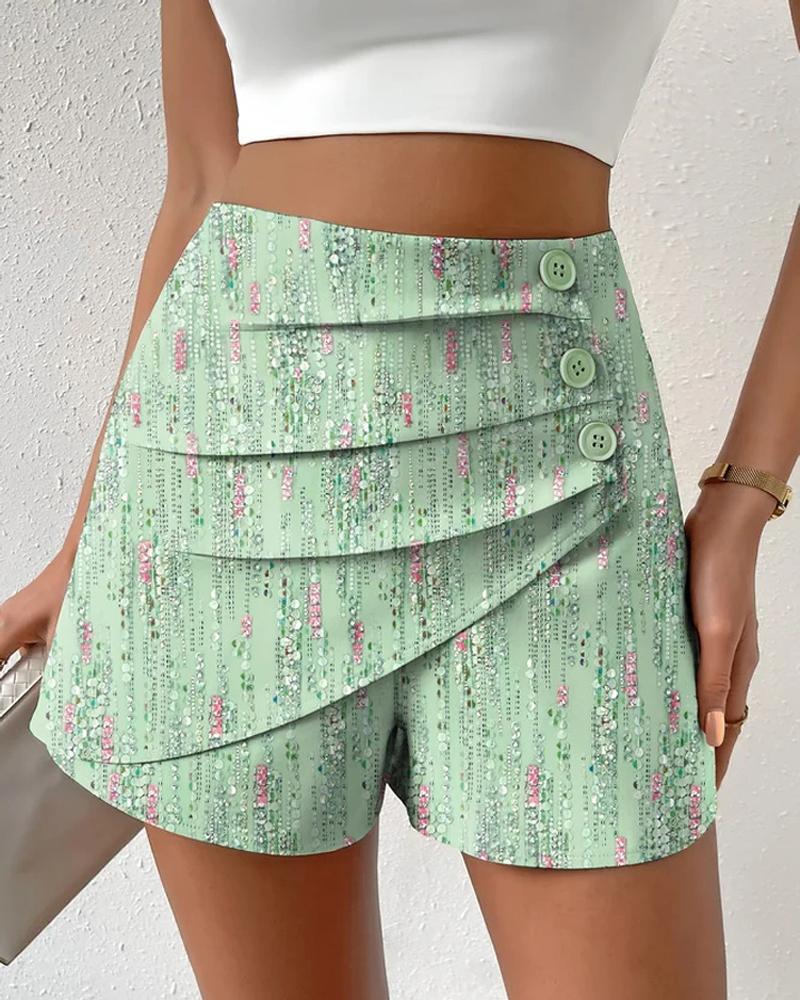 Abstract Print Ruched Buttoned Shorts, Green