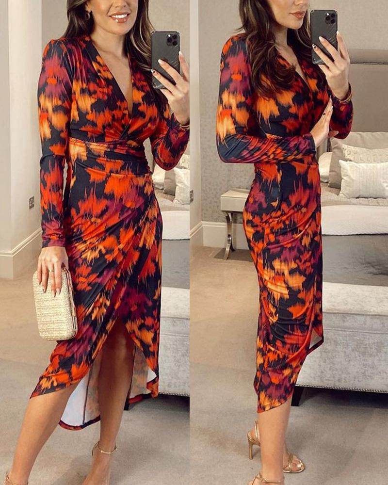 Abstract Print Split Ruched Long Sleeve Dress, Multicolor