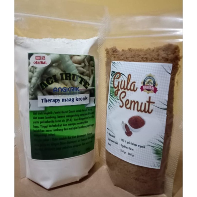 Aci irut/angkrik /umbi Garut Cocok untuk terapi maag dan asam lambung, karena mengandung senyawa Bioaktif yaitu polisakarida larut air (PLA) dan diosgenim bersifat basa, Tinggi karbohidrat dan mampu menetralkan kelebihan asam lambung dan melapisi lambung sehingga mengurangi iritasi. Aturan pakai : Satu sendok Aci irut dicampur dengan satu gelas air dingin (bisa dicampur air hangat dan gula merah) diminum pagi sebelum sarapan dan sebelum tidur