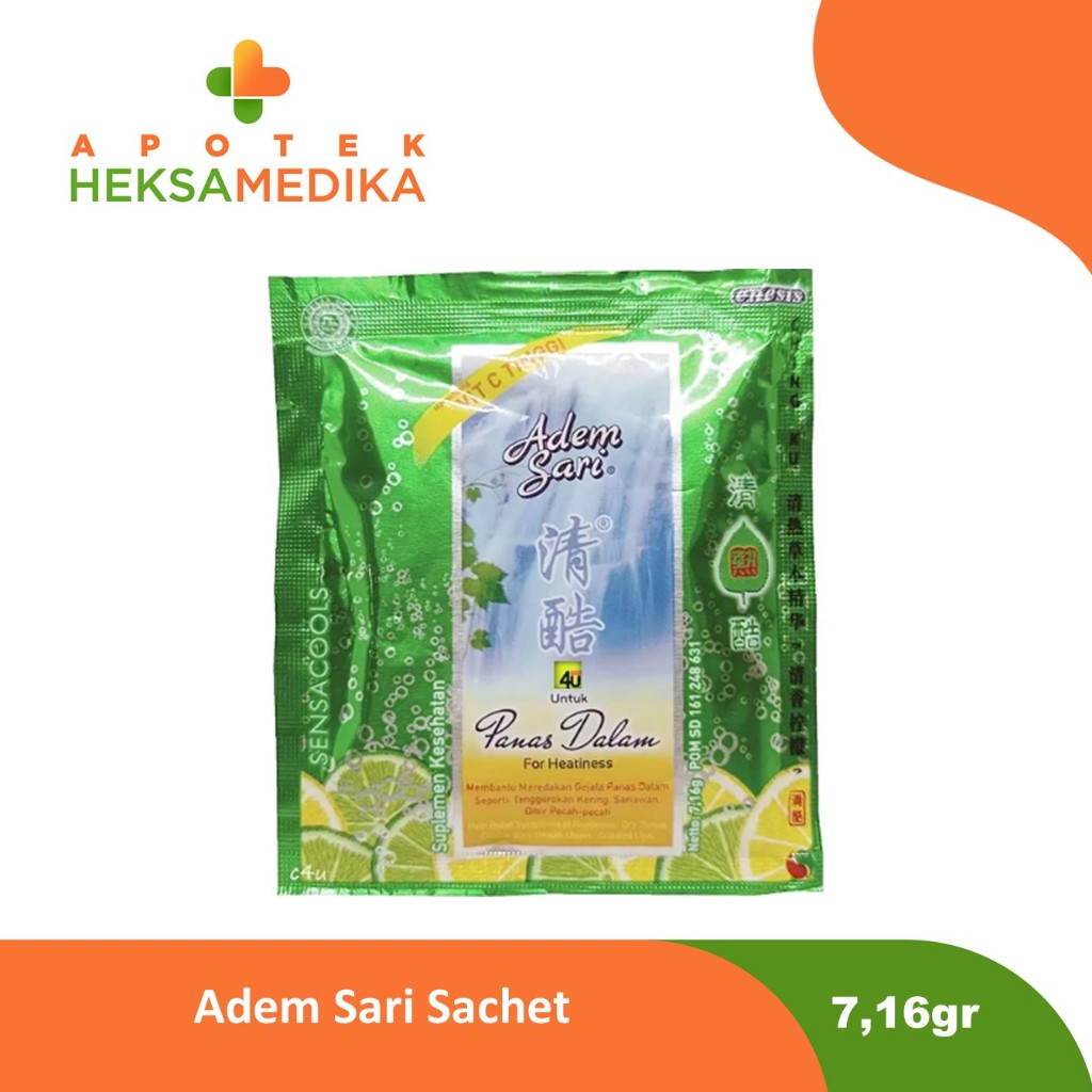 Adem Sari Sachet adalah minuman serbuk sebagai suplemen kesehatan yg membantu meredakan gejala panas dalam yg juga bisa dikonsumsi utk anak sesuai dosis tertera di kemasan. Adalah Adem Sari Panas Dalam, produksi PT. Sari Enesis Indah - Bekasi. Minuman bersensasi menyegarkan, ringan, dan berkhasiat mengademkan tubuh. Tidak hanya itu, minuman ini pun mengandung vitamin C yg bersifat anti oksidan. Dgn petunjuk penyajian super praktis: tanpa harus diaduk. Terkenal hingga ke manca negara, dikemas dalam berbagai kemasan salah satunya sachet individu dgn netto 7,16 gr. Beratribut lengkap BPOM RI dan Halal MUI.