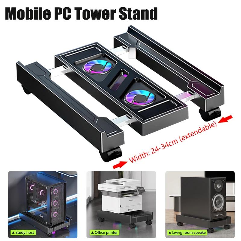 Adjustable Computer Tower Stand with Cooling Fan Mobile CPU Holder 4 Rolling Casters PC Floor Cart PC Riser Under Desk CPU