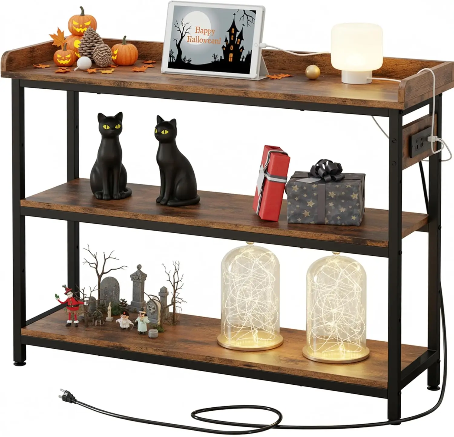Adjustable Height Rustic Brown Console Table with Power Outlet, Easy Assembly for Living Room Entryway