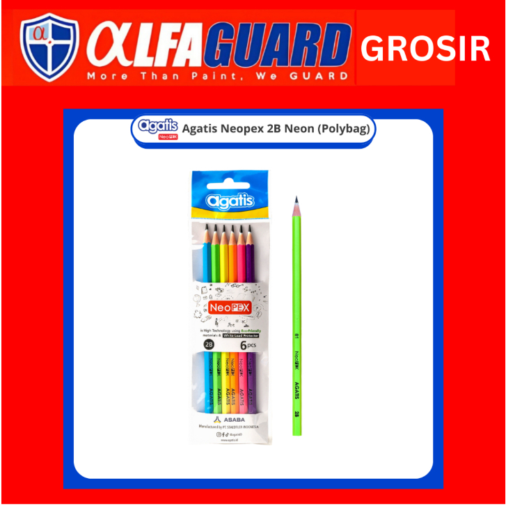 Pensil Neopex Neon, dengan coating warna neon menyala menambah nilai unik, lebih menarik dan memberikan kesan penuh warna yang ceria. Lebih hemat dan ekonomis dengan kemasan isi 6 pensil yang sudah diraut. Pensil yang telah diraut bisa langsung dipakai tanpa harus ribet cari rautan. Dengan teknologi Neopex, pensil Agatis jadi satu-satunya pensil yang memiliki cincin putih pelindung. Cincin putih berfungsi untuk melindungi isi pensil agar tidak mudah patah dan membuatnya tampak lebih indah. Terbuat dari bahan woodless yang bersifat eco-friendly, pensil Agatis Neopex juga aman dipakai oleh anak-anak.