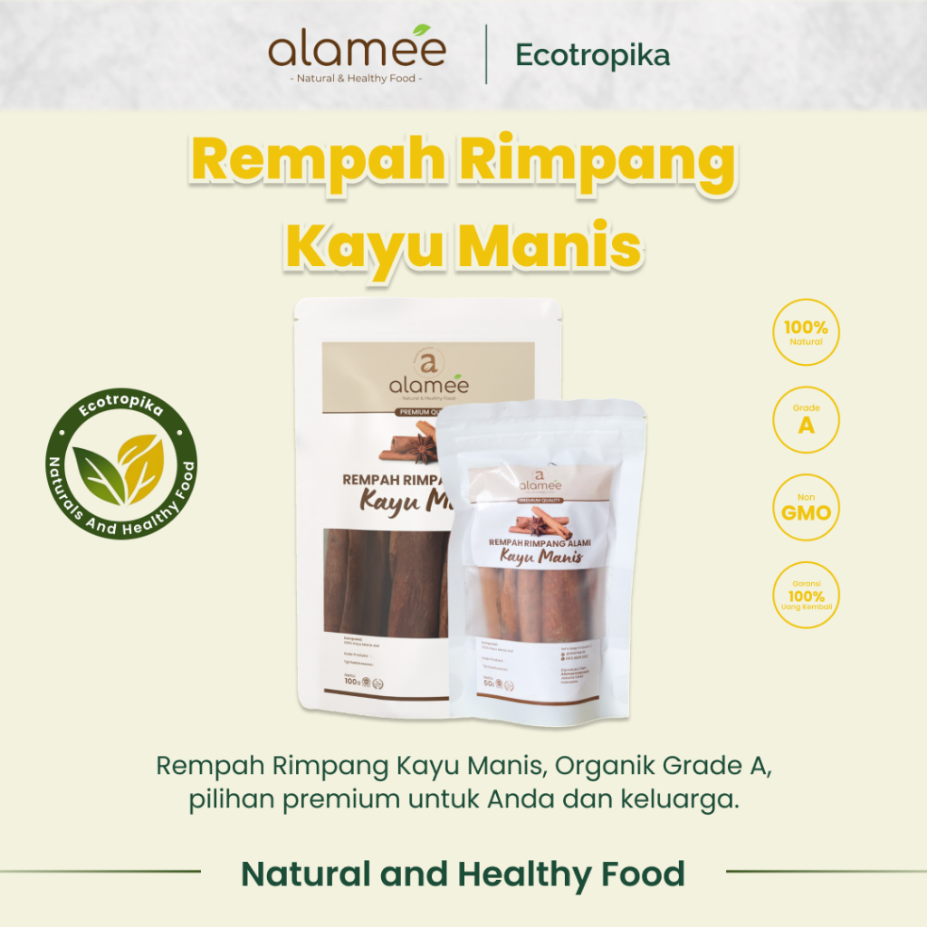 Kayu Manis Alamee adalah Kayu Manis asli tanpa campuran dan pengawet sehingga aman untuk dikonsumsi dan dengan citra rasa yang berkualitas tinggi.