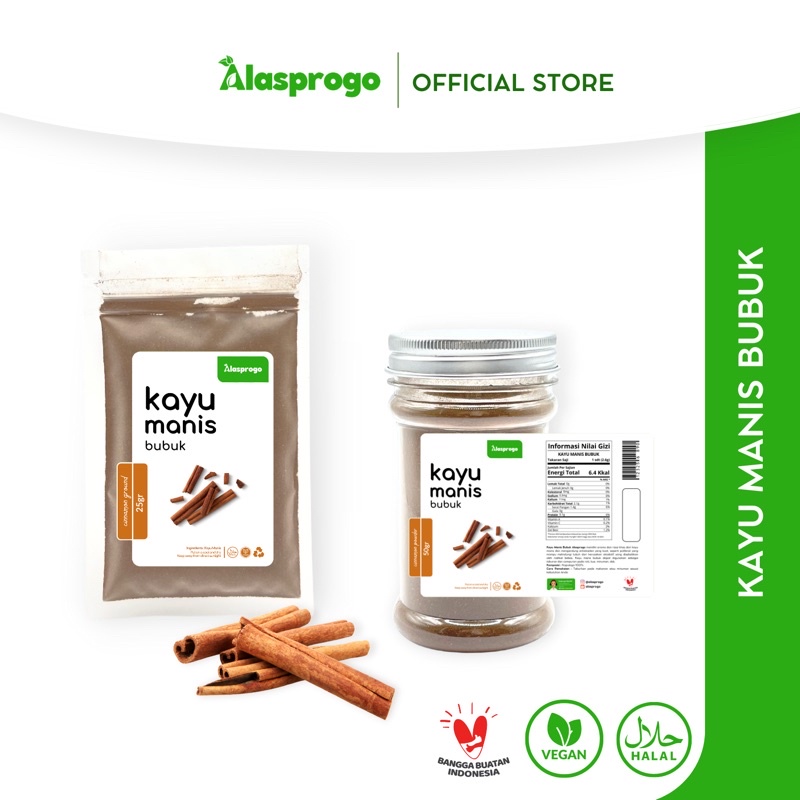 Kayu Manis Bubuk Alasprogo memiliki aroma dan rasa khas dari kayu manis dan mengandung antioksidan yang kuat, seperti polifenol yang mampu melindungi tubuh dari kerusakan oksidatif yang disebabkan oleh radikal bebas. Kayu manis bubuk dapat digunakan sebagai taburan dan campuran pada roti, kue, minuman, dsb.