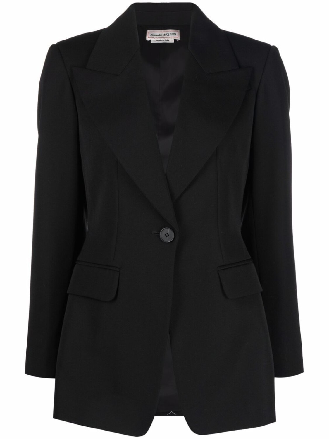 Заостренные лацканы, застежка на пуговицах спереди, длинные рукава, два передних кармана с клапанами, детали с оборками и застежка на завязке сзади. Цвет: черный.