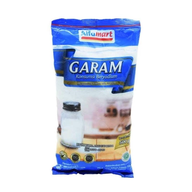 Alfamart Garam 500 g adalah garam konsumsi yang mengandung yodium min. 30 ppm. Garam beryodium selain sebagai penyedap masakan, juga bermanfaat untuk mencegah penyakit gondok, dan penurunan IQ. Tersedia dalam kemasan bag 500 g.