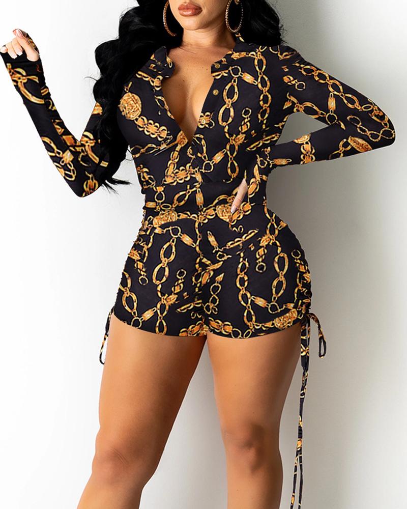 All Over Print Button Front Drawstring Ruched Romper, Style3