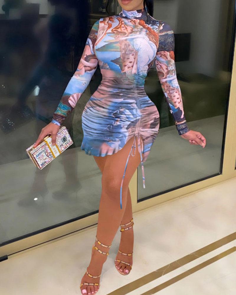 All Over Print Drawstring Ruffles Hem Ruched Bodycon Dress, Blue