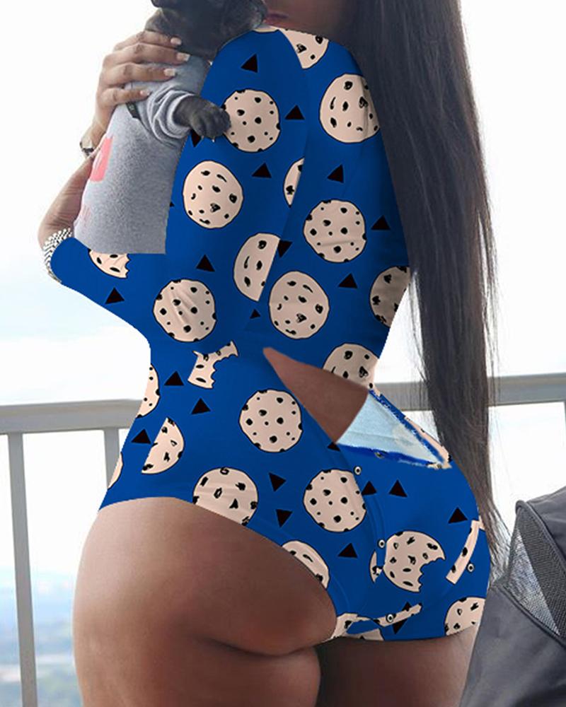 All Over Print Functional Design Long Sleeve Romper, Blue